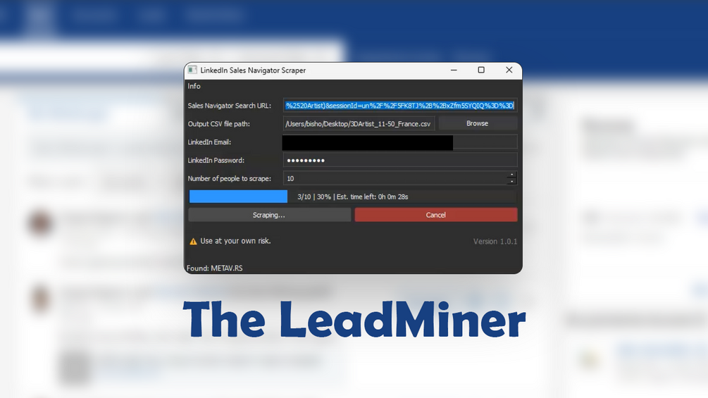 Please be aware that the LeadMiner is a powerful tool that automates data extraction from LinkedIn Sales Navigator. However, scraping data from websites may violate the terms of service of certain platforms, including LinkedIn. Use this tool at your own risk. It is your responsibility to ensure that you comply with LinkedIn's policies and any applicable laws in your region.